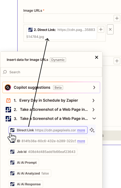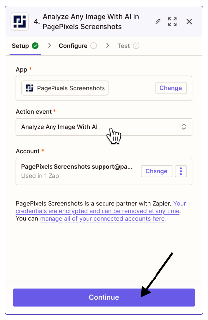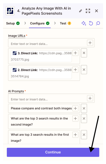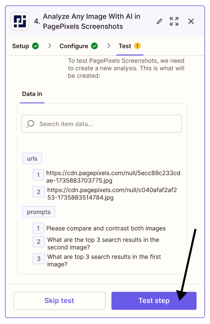 Using the PagePixels Screenshots Zapier app, you can automatically run AI-powered analysis on multiple images guided by your custom prompts in Zapier.