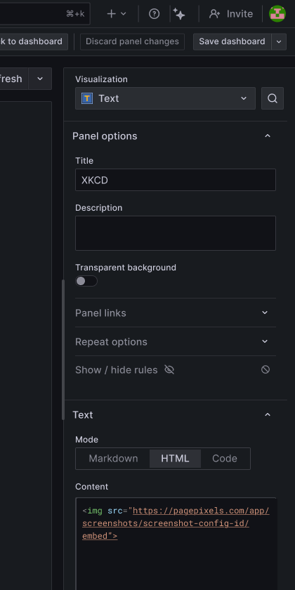 PagePixels is free to start and this tutorial demonstrates how you can take daily screenshots of a random XKCD comic and display the image in your Grafana dashboard.