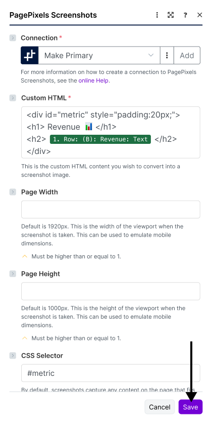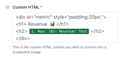 To accomplish this, you can use PagePixels' Create a Screenshot from Custom HTML Action in Make. This Action accepts data from one or more apps that you can wrap in HTML tags to create a custom screenshot.