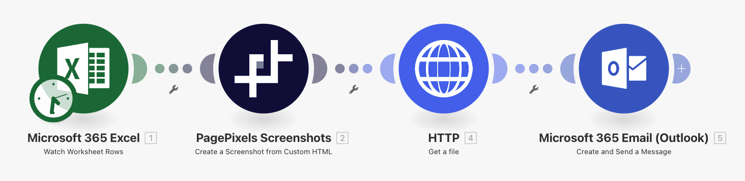 With the PagePixels Screenshots Make app, you can convert data from thousands of apps in Make.com into screenshots, including your Excel data.
