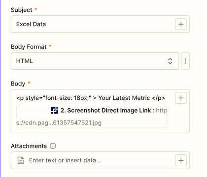 To accomplish this, you can use PagePixels' Take a Screenshot of Custom HTML Action in Zapier. This Action accepts data from one or more apps that you can wrap in HTML tags to create a custom screenshot.