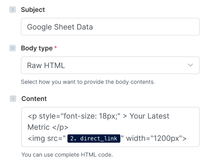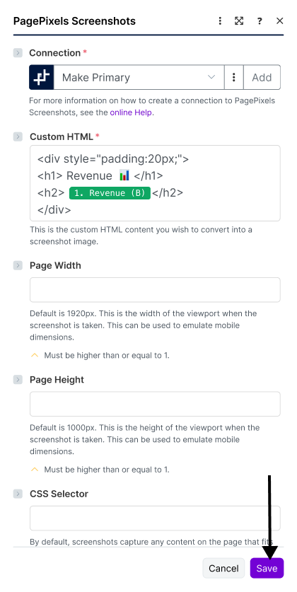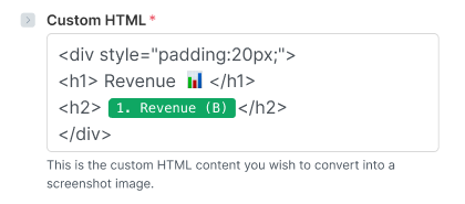 To accomplish this, you can use PagePixels' Create a Screenshot from Custom HTML Action in Make. This Action accepts data from one or more apps that you can wrap in HTML tags to create a custom screenshot.