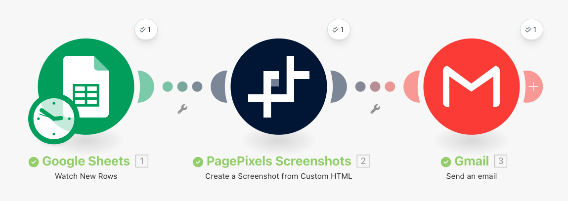 With the PagePixels Screenshots Make app, you can convert data from thousands of apps in Make.com into screenshots, including your Google Sheets data.