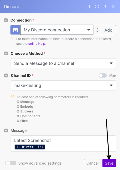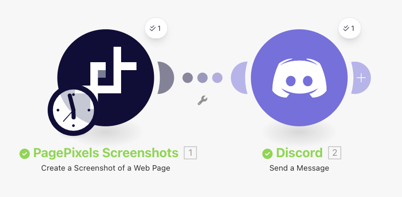 Using the PagePixels Screenshots Make app, you can automatically capture screenshots of web pages and send the images to thousands of services, including Discord.