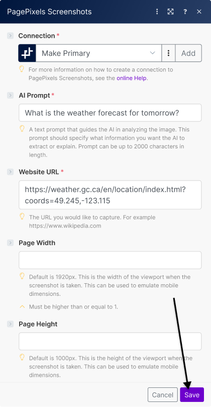 Using the PagePixels Screenshots Make app, you can easily automate screenshots and run AI-powered analysis on the captured images.