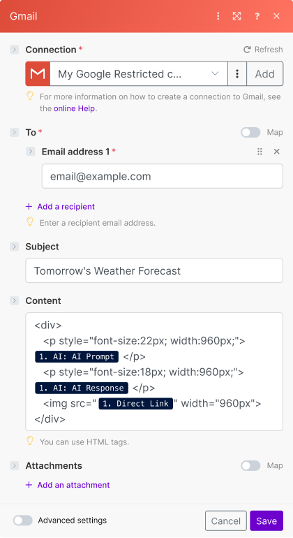 As an example, this tutorial demonstrates how to automate daily AI analysis screenshots of weather information and email the AI analysis results using Make's Gmail integration.