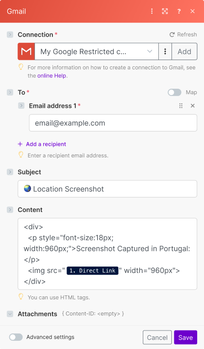 As an example, this tutorial demonstrates how to automate daily Real Locations screenshots and email the screenshot image using Make's Gmail integration.