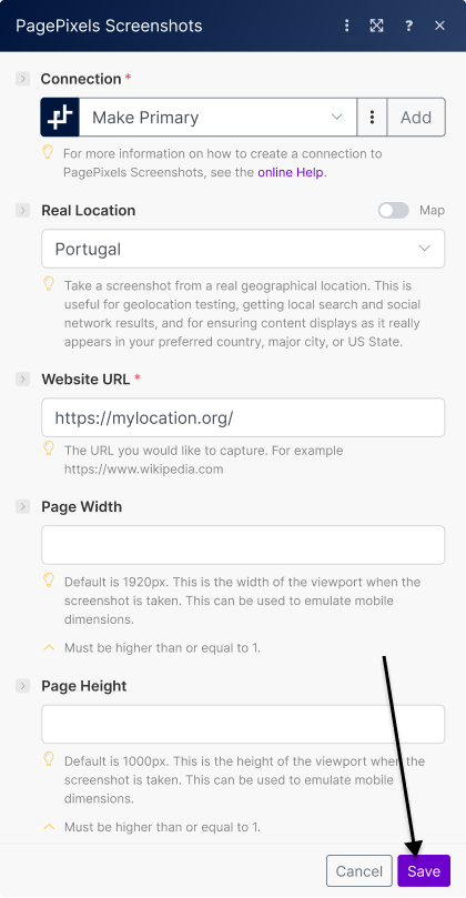 You can simply choose your desired location in the Make app. No proxy server setup required, and all PagePixels accounts get 32 MBs Real Location bandwidth for free per month.