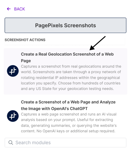 To access Real Locations in Make.com, you can use the PagePixels Screenshots Create a Real Geolocation Screenshot of a Web Page module in Make.